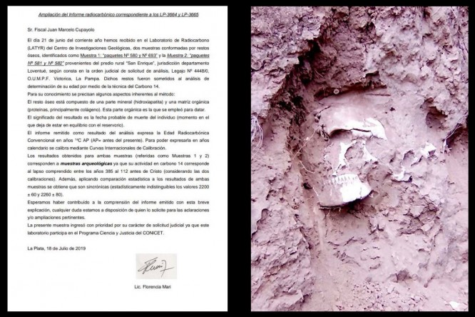 El informe remitido el 18 de julio de 2019 por el Laboratorio de Radiocarbono (LATYR) del Centro de Investigaciones Geológicas, ha permitido datar las muestras óseas que fueron extraídas de la Estancia San Enrique por el equipo de la Dirección Provincial de Patrimonio Cultural (DPPC) en noviembre de 2018, por pedido de la fiscal Alejandra Moyano González (Oficina Pública del Ministerio Público Fiscal IV Circunscripción Judicial de la Provincia de La Pampa).