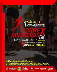 El sábado 1 de noviembre, en el Parque Recreativo Don Tomás, se realizará la correcaminata solidaria “Corre por Bomberos”. Está organizada por la Policía de La Pampa y cuenta con el acompañamiento de la Municipalidad de Santa Rosa, la Federación Atlética Pampeana y la Asociación Pampeana de Atletas Veteranos (APAV). La propuesta, abierta a toda la comunidad, busca reconocer y visibilizar el trabajo del Cuerpo de Bomberos de la Policía de La Pampa, al mismo tiempo que invita a vecinos y vecinas a sumarse a una actividad saludable y recreativa.
