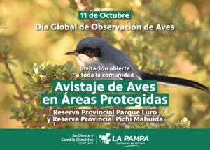 Está abierta la inscripción para participar, este sábado 11, del avistaje de aves y recorrido de senderos que se hará en las Reservas Provinciales de Parque Luro y Pichi Mahuida. En el marco del “Día Global de la Observación de Aves”, este sábado 11 de octubre se llevará a cabo una actividad especial de avistaje de aves en dos de las Áreas Protegidas Provinciales más emblemáticas: Reserva Parque Luro y Reserva Pichi Mahuida.