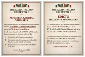 La Comisión Directiva de la Sociedad Italiana Umberto I, llama a elección de autoridades para cubrir sus cargos por el término que marca el estatuto debido al fallecimiento de varios de los integrantes y el vencimiento del mandato de los restantes para el día 25 de abril de 2026 a las 17 hs en la sede social sita en la calle 12 n°1050 de Victorica, La Pampa.